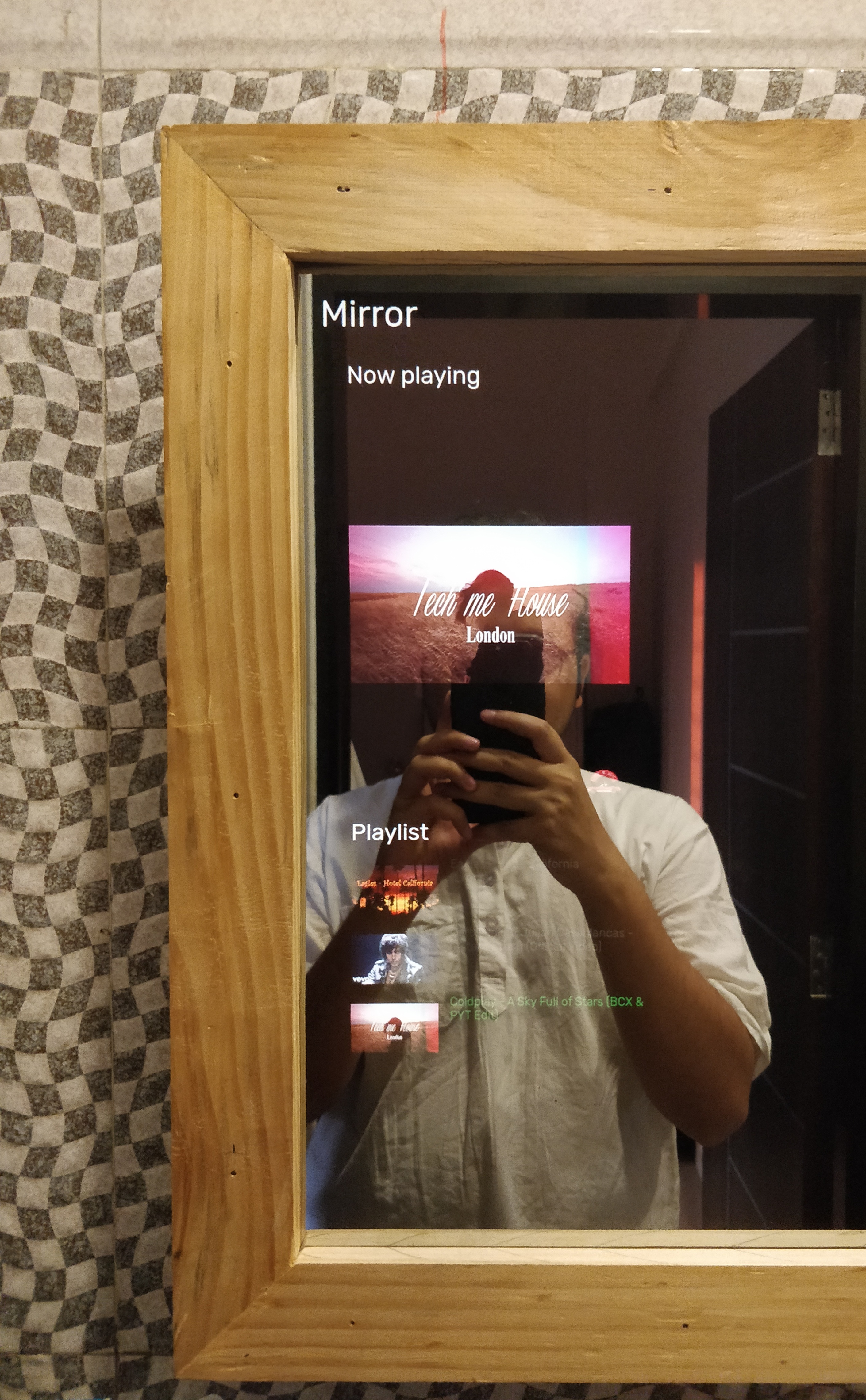 While building the mirror, I was reminded of an app that I and Kunal had built some time back. It was called Play This and it allowed playing music on one device and controlling it from others. Several devices could join the 'room' and add their favourite music to a single playlist. We used to play a lot of music while at TTT. What struck me was that this was perfect for the mirror! I could play music on the mirror using my phone! And after a few CSS changes, it worked perfectly.