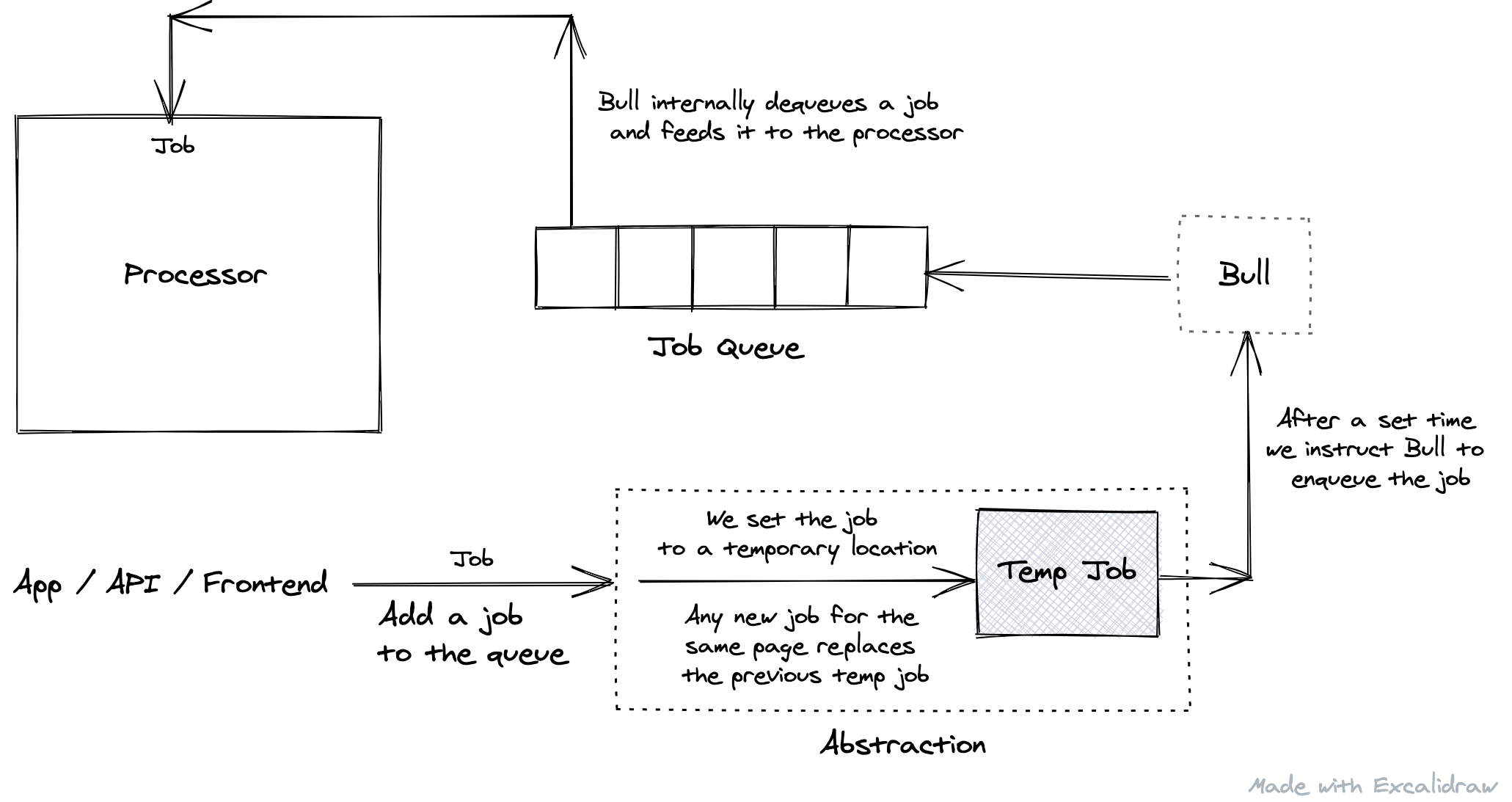 To acheive this, an abstraction was added before the step where the job was added to the queue. Whenever a request came in to add a job, it was first set to a temporary key in Redis. Any existing timeouts would be cleared and a new timeout would be scheduled, for say 10 seconds, to pickup the job from the temporary position and add it to the queue. So if another request came in for the same page, it would replace the Redis value. Finally when there are no new add jobs requests, we would add the job the queue.