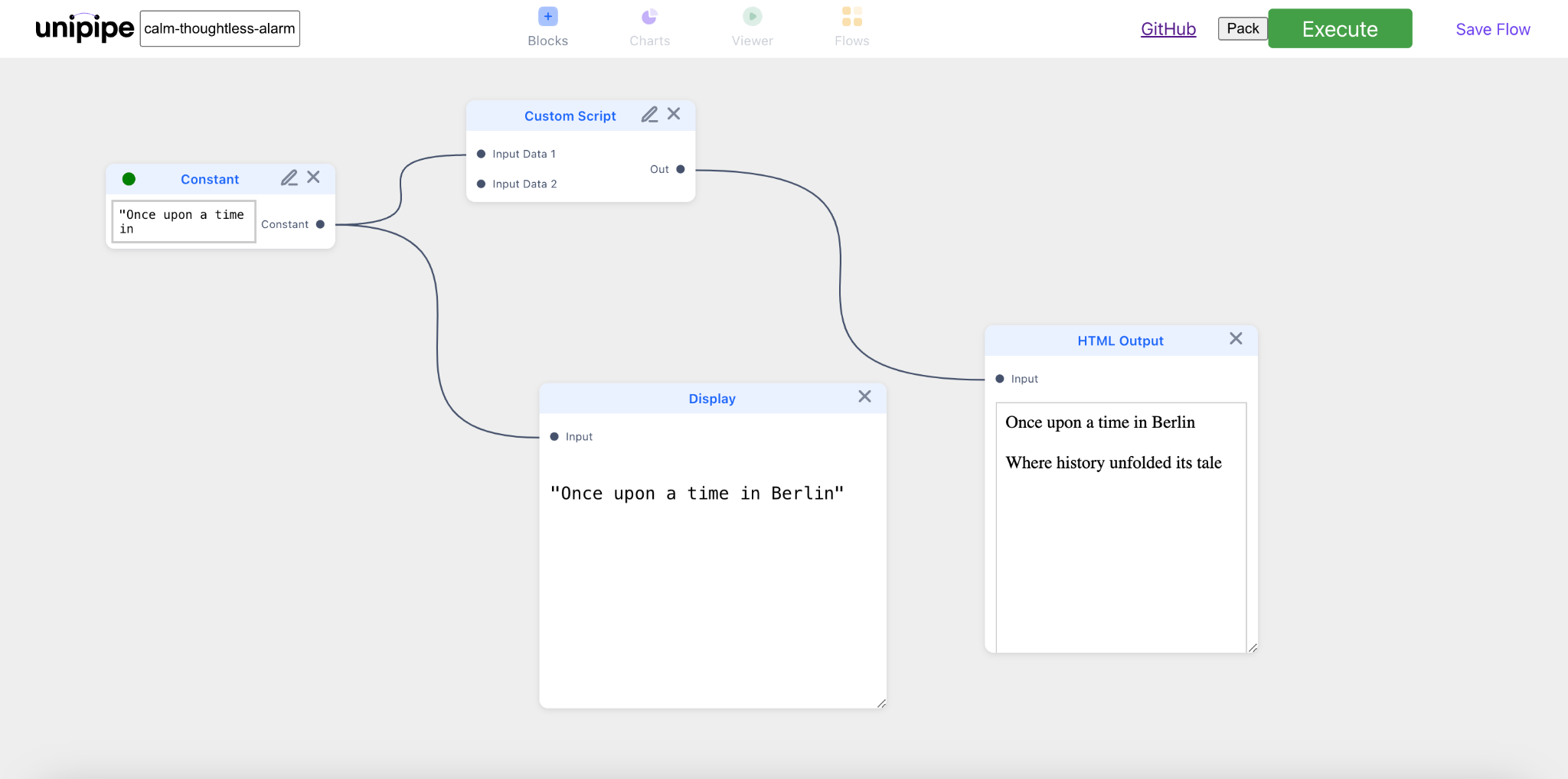 I have pondered over the idea of visual programming and enriched code execution environments for quite some time. My previous project unipipe, played with the idea of block-based visual programming in the browser. I experimented a lot with JavaScript execution and providing ready-made blocks that could be plugged into an existing flow. With an increased interest in large language models, I was tempted to extend this idea to include a LLM-based block in the environment that could take in an input and apply a prompt over the input data.